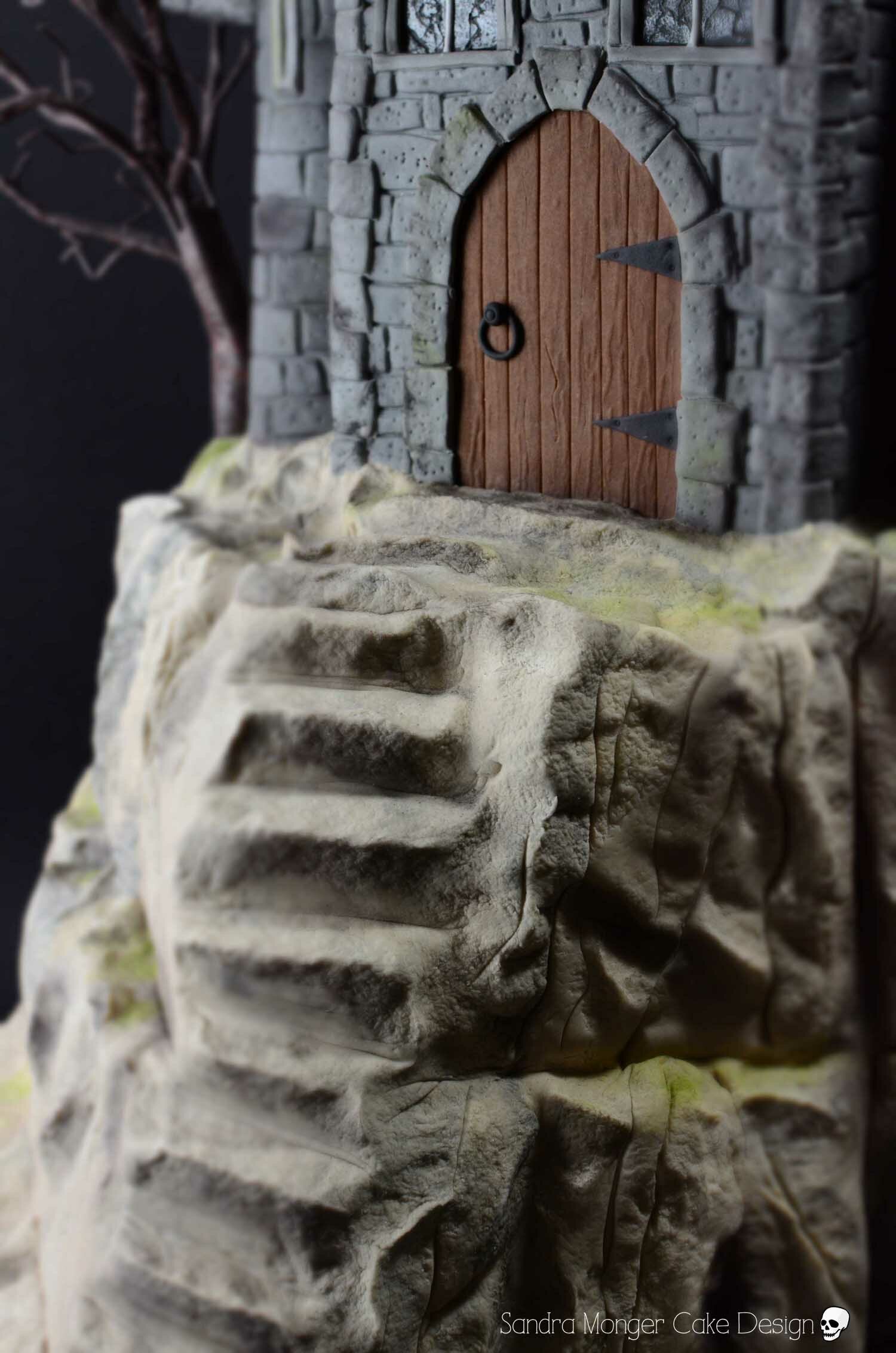 The jagged rock effect was created by covering the tiers with a marbled mixture of white, brown and grey sugarpaste. The jagged, rocky appearance was then developed by dragging a dresden tool over the surface of the sugarpaste. Clean scouring pads were used to pinch and squeeze the surface to form a rocky texture. The steps that lead up to the castle were formed using this technique.