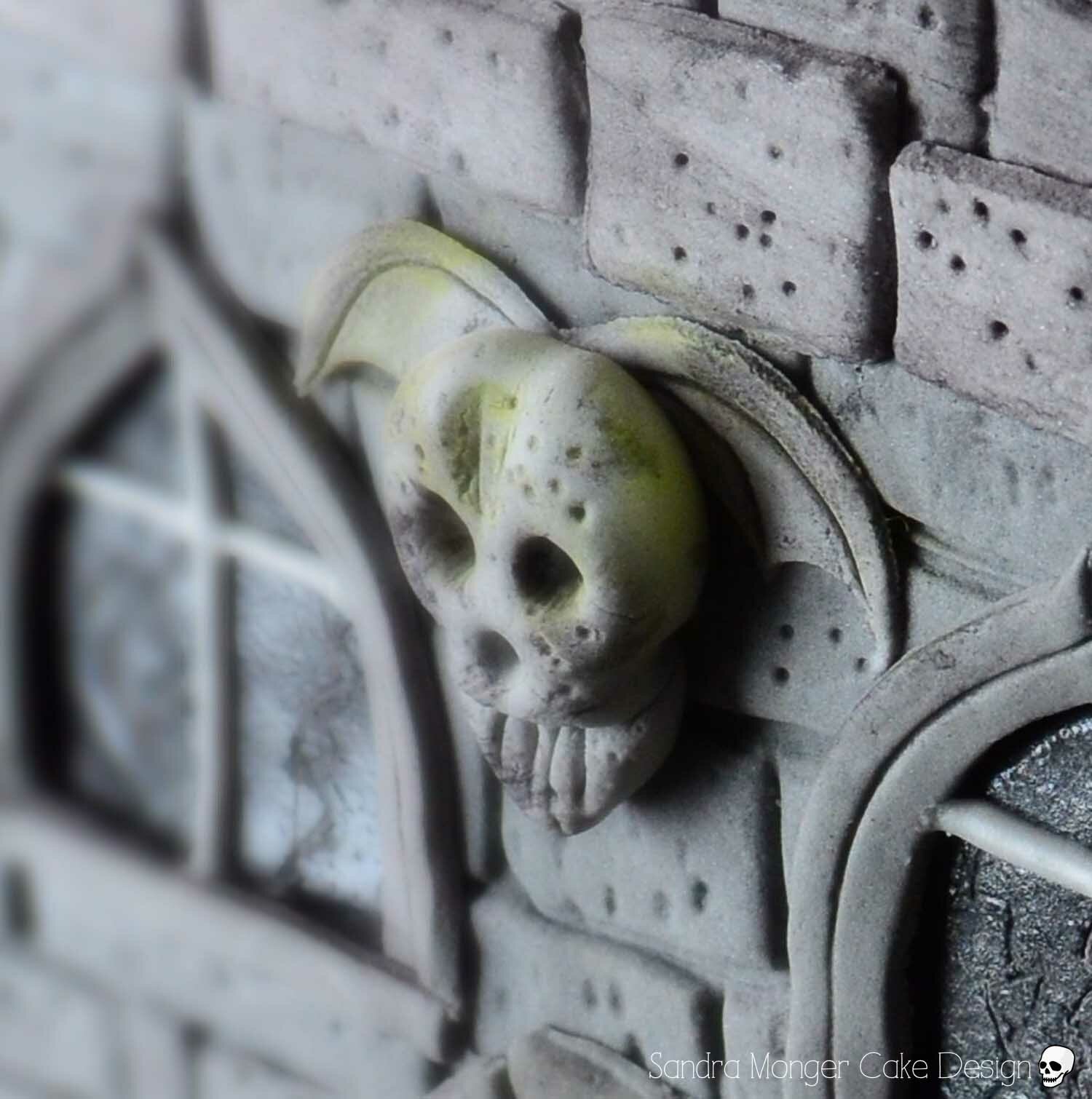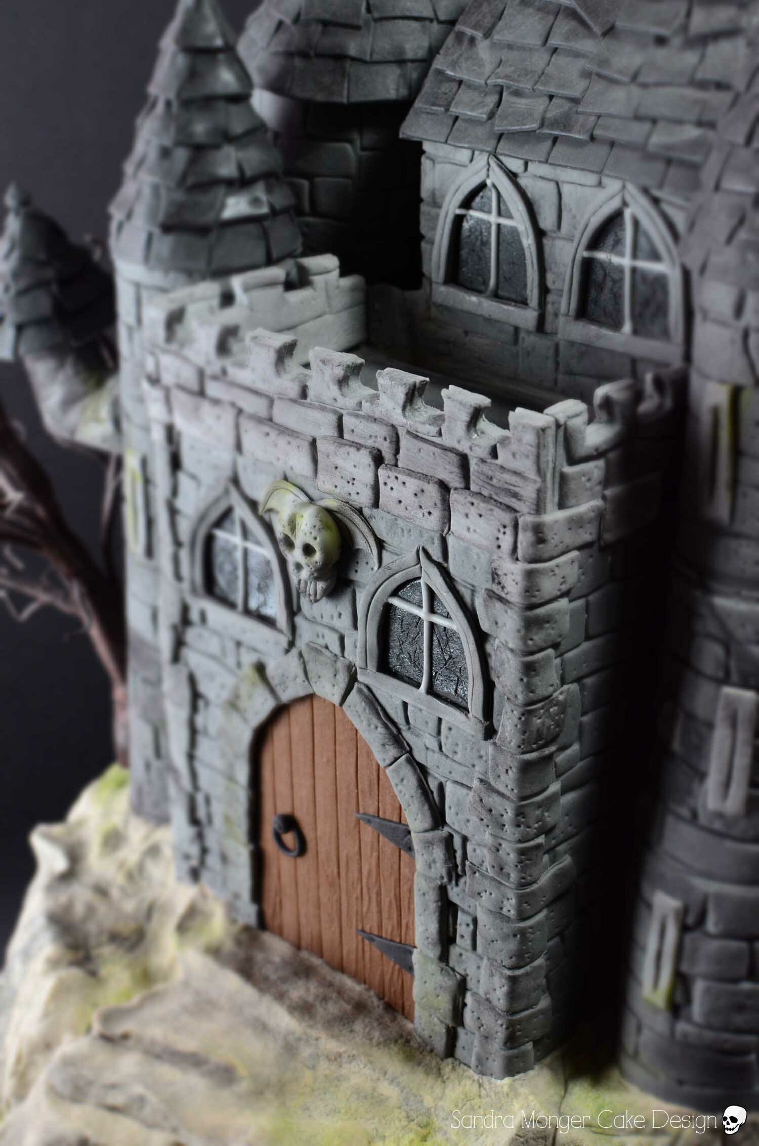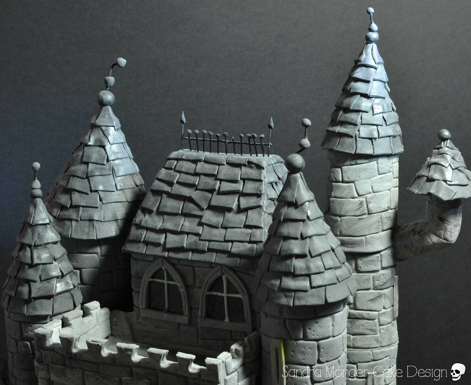 The cake is formed of two parts - the castle and the ghostly rocky crag on which it perches precariously. A range of tools, materials and ghostly spells were used to create form, texture and effect.