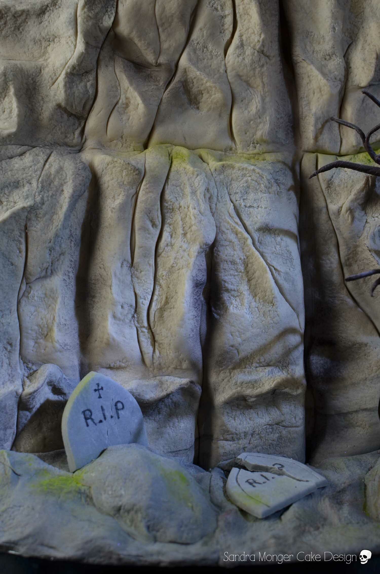 The gravestones were made from grey modelling paste cut out using a shield cutter with details added using an edible pen.